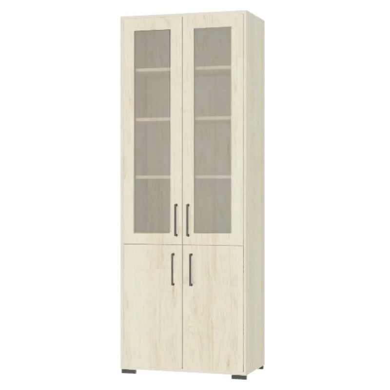 - Шкаф оснащен в верхней части двумя дверями со стеклом и в нижней части двумя дверями из ДСП с закрытыми полками.