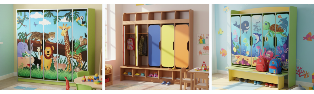 В ассортименте представлены стеллажи  для обуви, лавки и  шкафчики для раздевалок:  классических моделей,  со встроенной скамейкой, с подставкой для обуви из хромированных труб. Данная мебель изготовлена в  ярком дизайне. Большим спросом пользуются красочные модели шкафчиков, выполненные в разных вариациях  разноцветные и  мультяшного дизайна с водостойкой фотопечатью – Сафари,  Подводный Мир, Чудо-Дети и В деревне у Бабушки. Также стоит отметить, что шкафчики могут быть как одноместные, так и 2-местные, 3-местные, 4-местные и  5-местные.