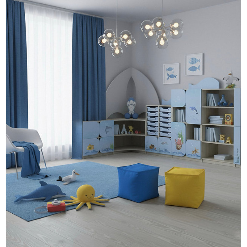 - Фасады шкафчика фигурные со специальной выемкой для открывания и декорированы водоустойчивой фотопечатью с изображениями морской тематики.