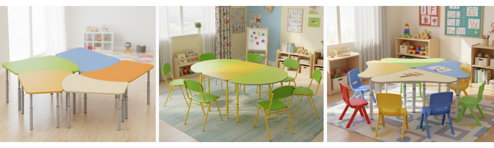 В ассортименте есть столики различных вариантов дизайна – в форме лепестка, цветка и колокольчика, это дает возможность использовать столы не только для групповых занятий, но и для индивидуальных. Каждый стол оборудован системой регулировки по высоте. Это позволяет отрегулировать параметры стола под любую возрастную категорию. Благодаря чему осанка ребенка не будет деформироваться, а будет всегда находиться в правильном положении. Также стоит отметить, что стол оснащен переходными втулками и пластмассовыми наконечниками, защищающие пол от царапин.