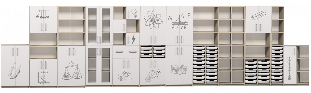 Шкафы и стенки для хранения учебных материалов — учебников, лабораторного оборудования, моделей и пособий. Доступны закрытые, открытые и полузакрытые шкафы, а также шкафы с лотками и полками для удобного хранения мелких предметов.