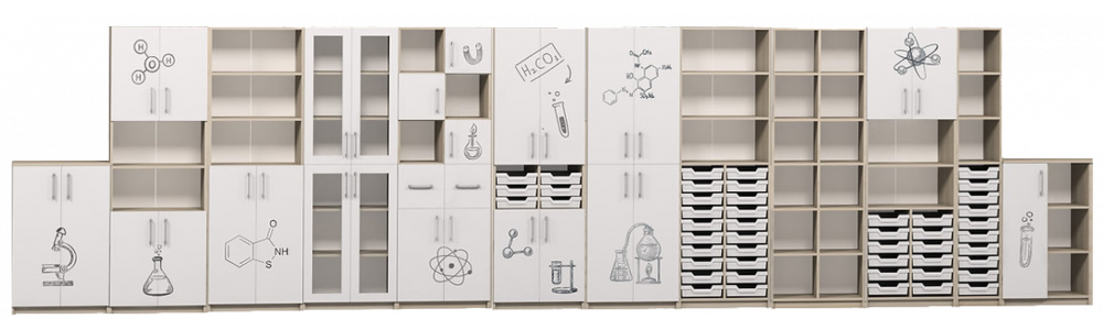 • Шкафы и стенки для хранения учебных материалов и химической посуды — пробирки, колбы, реактивы, учебники и тетради. Доступны модели с открытыми, закрытыми и полузакрытыми отделениями, а также шкафы с лотками для безопасного хранения мелких предметов.