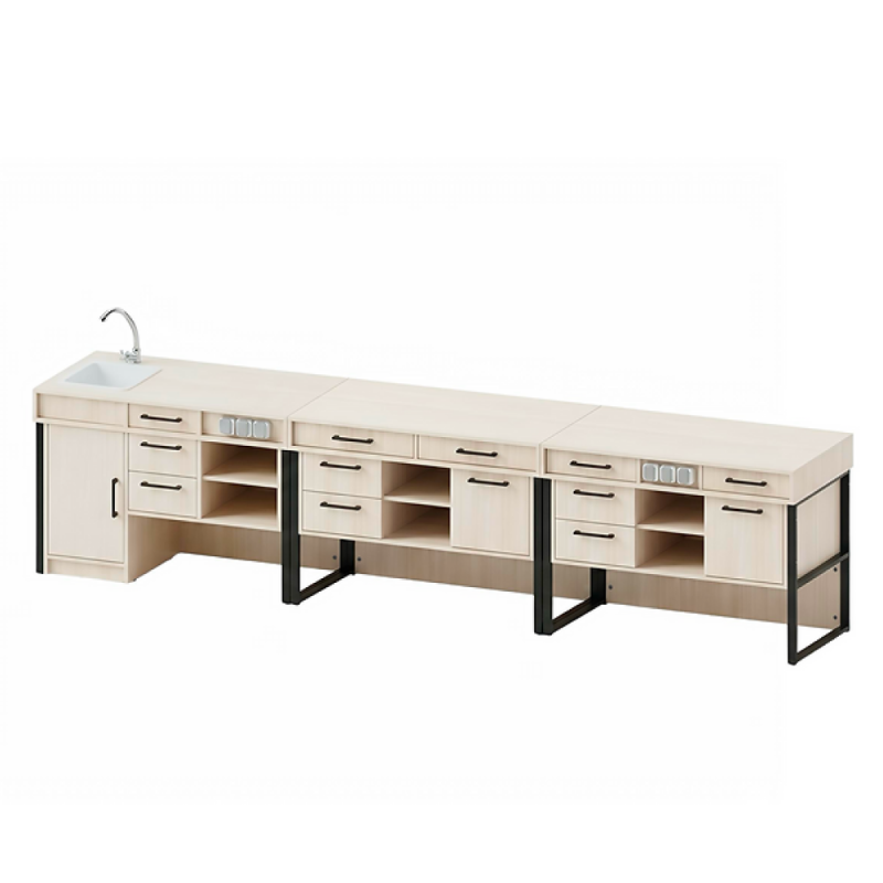 - Масата се състои от плот, шкаф и централна част с три контакта.