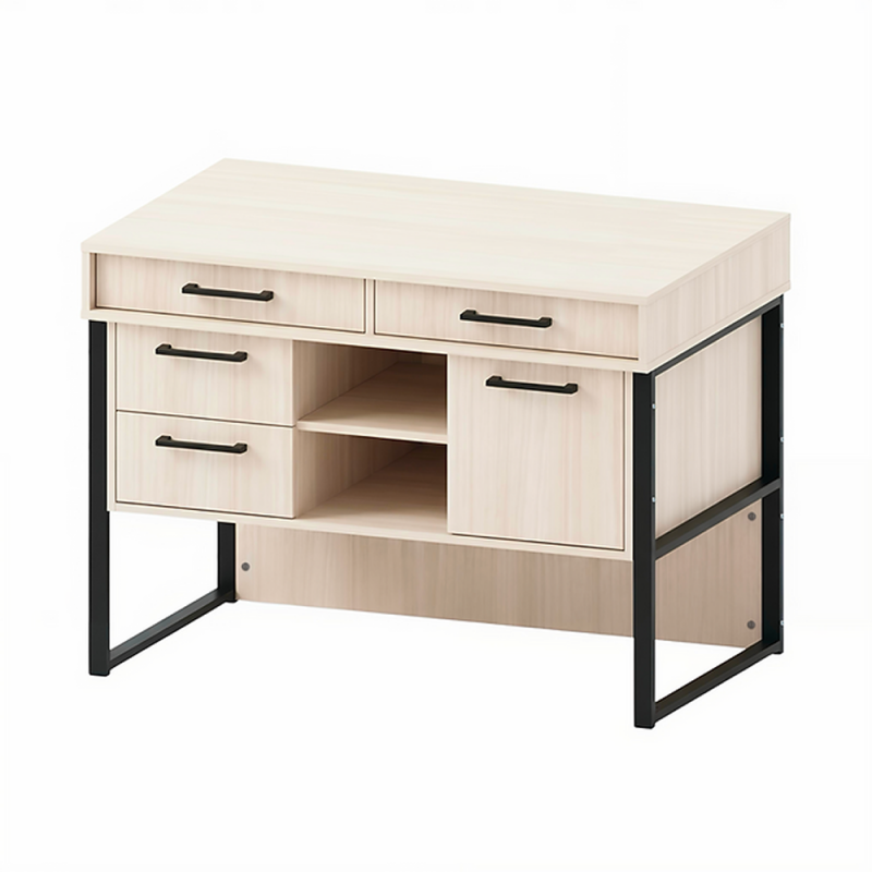 - Шкафът се състои от три отделения. Вляво са разположени две чекмеджета на сачмени водачи, по средата — открит рафт, а вдясно — отделение с рафт, затворено с вратичка.