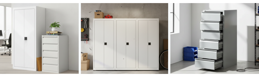 - В ассортименте представлены модели с различными конфигурациями: от шкафов с регулируемыми полками, которые можно адаптировать под папки и архивные коробки разного размера, до шкафов с выдвижными ящиками, оснащенными замками и скрытыми петлями для дополнительной безопасности.