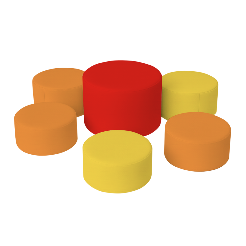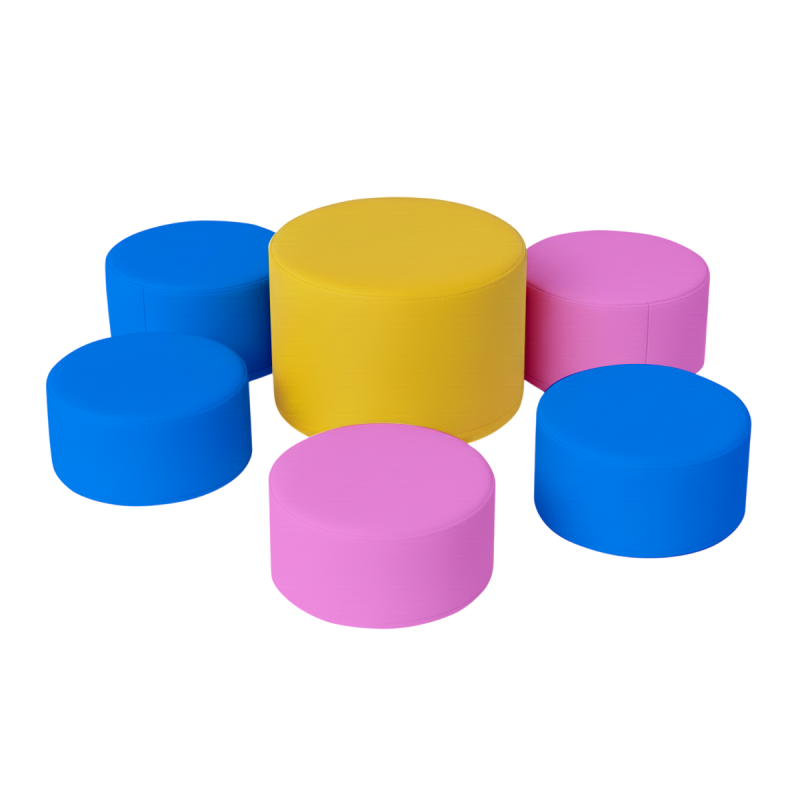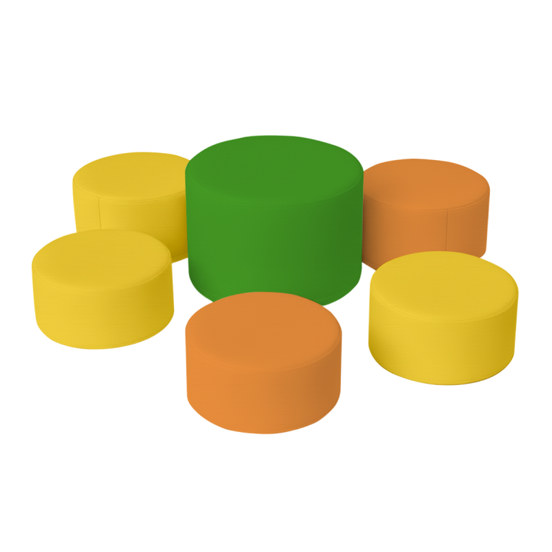 - Комплект детских игровых пуфов состоит из стола и пяти стульев.