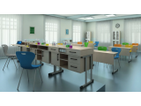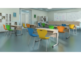 Просторный класс оборудован удобными разноцветными стульями и прочными столами, которые легко перемещать и комбинировать для различных форм работы.